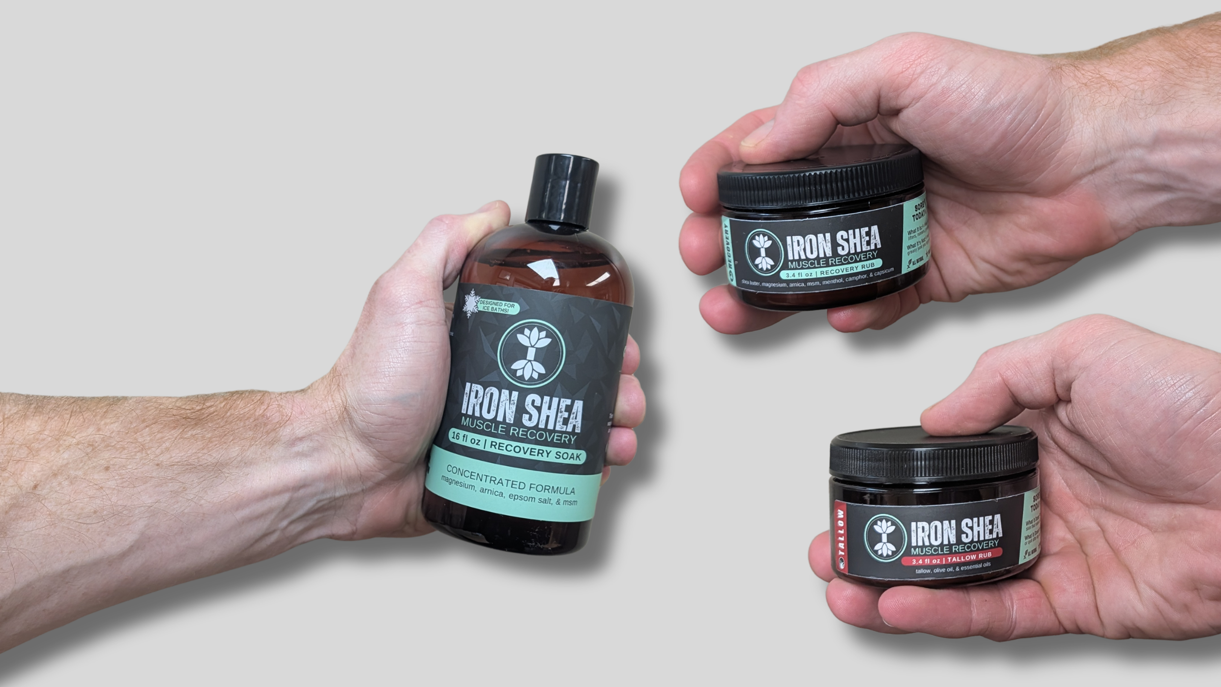 Start with Iron Shea Muscle Rub to target sore or tight muscles. Think of it as your warm-up for recovery. No batteries required, just elbow grease and commitment.
